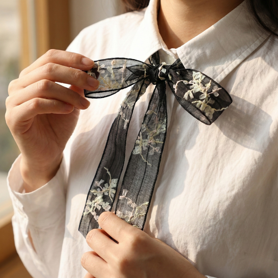 Exquisite Black & White Design: Signature H9Neko ribbon featuring intricate raised white floral embroidery on a translucent black background for a romantic, high-contrast look.